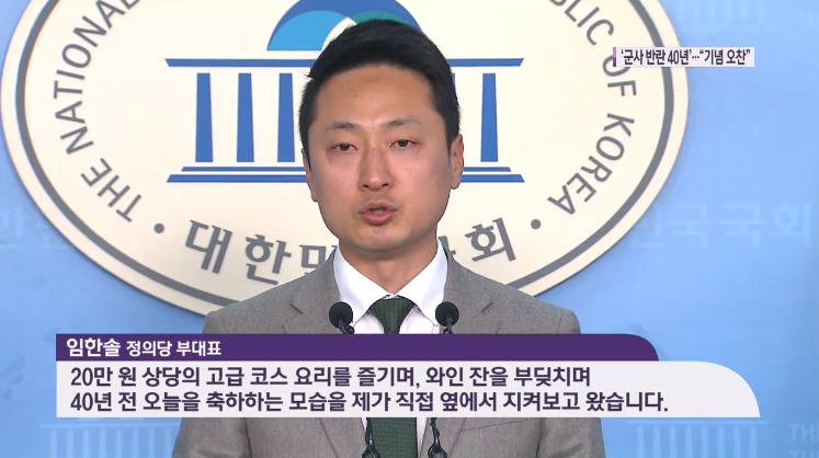 임한솔 정의당 부대표가 지난달 골프장에 이어 12일 강남의 고급 식당에서 오찬을 즐기는 전두환 씨의 모습을 공개했습니다. 공교롭게도 이날은 전 씨와 노태우 등이 이끌던 군부 내 사조직인 '하나회' 중심의 신군부세력이 일으킨 12·12 군사반란사건을 일으킨 지 40년이 된 날 입니다.