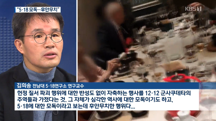 전 씨의 오찬을 촬영한 임 부대표는 "전두환이 대화 상당 부분을 주도했다. 건배사를 여러 번 하고 와인잔을 계속 부딪치며 12·12 당일이란 점을 까맣게 잊은 듯 굉장히 밝고 화기애애하고 축하 분위기 속에서 오찬을 즐기는 모습을 확인했다"라고 설명했습니다.