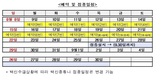 우선 18세∼49세 국민 1천777만 명(지자체 자체 접종 200만 명 포함)에 대한 1차 접종이 다음 달 26일부터 9월 30일까지 시행됩니다. 이들은 화이자나 모더나 등 mRNA(메신저 리보핵산) 계열 백신을 전국 위탁의료기관과 예방접종센터 중 희망하는 기관에서 접종합니다. 이들의 사전예약은 다음 달 9일부터 9월 17일까지 이어집니다. 세부적으로 보면 다음 달 9∼18일에는 주민등록번호 생년월일 끝자리를 기준으로 한 10부제 예약이 우선 진행됩니다. 이어 다음 달 19일∼21일에는 연령대별 추가 예약이 이뤄지고, 같은 달 22일부터 9월 17일까지는 18∼49세 전체에 대한 추가 예약과 함께 기존 예약 변경도 가능합니다.