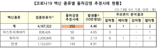 그러면서 "추정사례로 돌파감염을 살펴보는 것은 (상황을) 모니터링하고 이상징후를 보기 위함인데, 이는 추정사례 통계만으로도 충분하다고 보기 때문에 확정사례 통계는 별도로 분류해 관리하고 있지 않다"고 부연했습니다. 돌파감염 사례는 백신별로 얀센이 364건으로 가장 많았고 화이자가 145건, 아스트라제네카(AZ) 138건으로 나타났습니다. 백신접종 10만 건당 비율로는 얀센이 32명, AZ 백신이 14.1명, 화이자는 4.4명으로 파악됐다. 전체 돌파감염 추정사례는 10만 건당 12명 꼴로 발생했습니다.