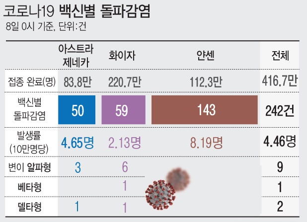 오늘(21일) 중앙방역대책본부는 지난 19일 0시 기준으로 국내 돌파 감염 추정 사례는 모두 647명으로 확인됐다고 밝혔습니다. 이는 지난 8일 0시 기준으로 집계된 252명보다 395명 많은 것인데 11일 만에 두 배 이상으로 증가한 수치입니다. 백신 별로 보면 얀센이 364명으로 가장 많고 이어 화이자 145명, 아스트라제네카(AZ) 138명 순입니다.