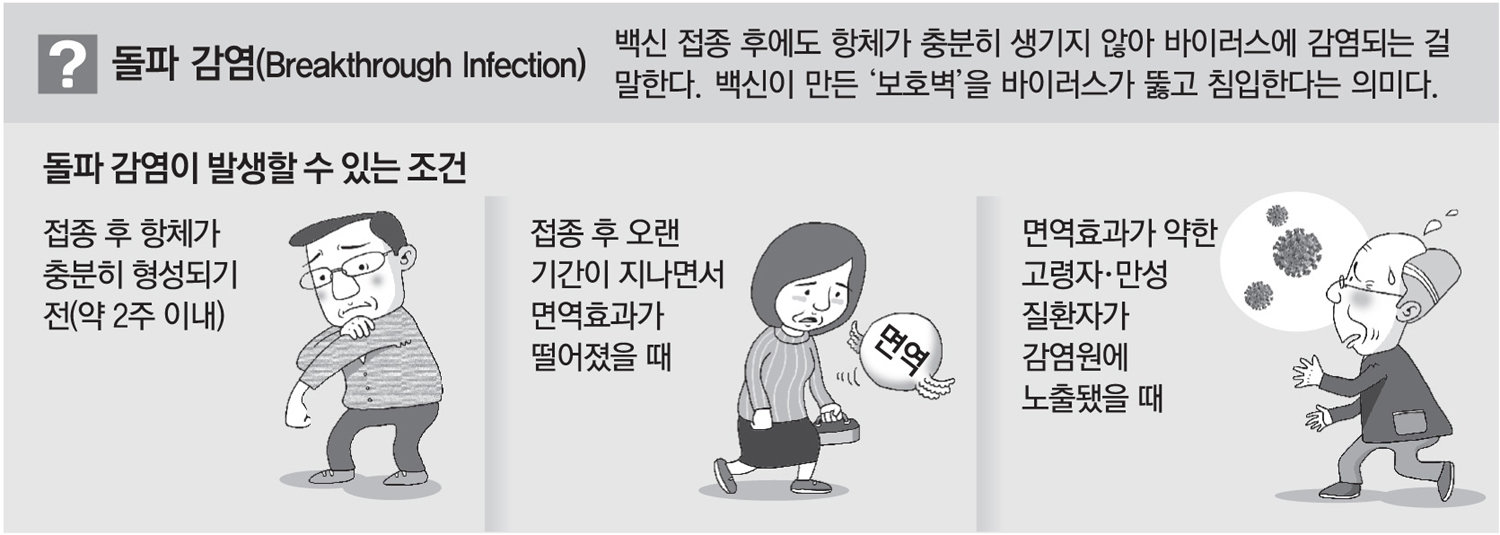 국내외에서 코로나 19 백신을 맞았는데도 양성 판정을 받는 이른바 '돌파 감염' 사례가 이어지고 있습니다. 델타 변이 바이러스가 최근 빠른 속도로 번지고 있는 상황에서 자꾸 변종을 하는 코로나 19에 기존 백신의 효과가 떨어지는 것이 아니냐는 우려가 커지고 있습니다. 돌파 감염(Breakthrough infection)은 정해진 접종 횟수를 다 채우고 2주의 항체 형성 기간이 지난 뒤 코로나19에 감염되는 사례를 말합니다.