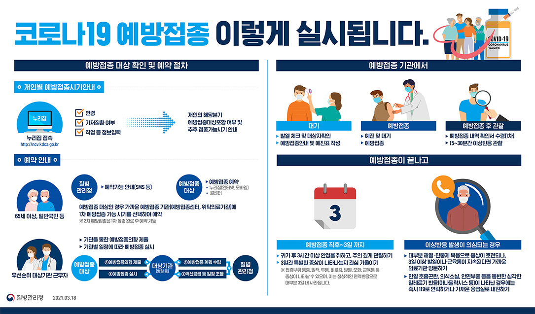 다만 신청자가 한 번에 몰리는 것을 방지하기 위해 추진단은 3일에는 수도권 접종 대상자, 4일에는 비수도권 접종 대상자, 5∼6일에는 전체 접종 대상자에게 예약을 하도록 일정을 분산했습니다. 사회적·신체적 제약으로 인해 코로나19 백신 접종에 참여하기 어려운 대상자들도 다음 달부터 접종을 받습니다. 우선 방역수칙을 지키기 어려운 발달장애인과 코로나19 감염시 중증 진행 위험이 높은 심장·간 관련 장애인, 집단생활로 인해 감염 위험이 높은 직업재활시설 이용자 등 총 29만6천 명은 다음 달 26일부터 예방접종센터와 위탁의료기관에서 화이자 또는 모더나 백신을 맞습니다.